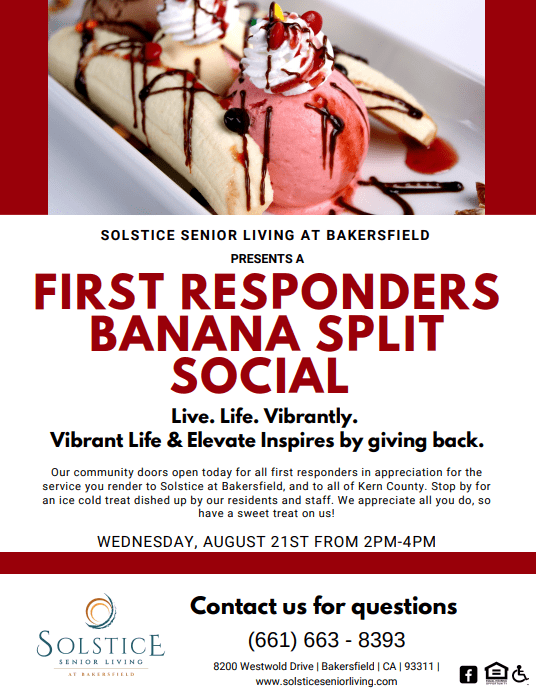 Join us for a First Responders Banana Split Social! This is our way of showing appreciation for everything first responders do for Solstice at Bakersfield and all of Kern County.